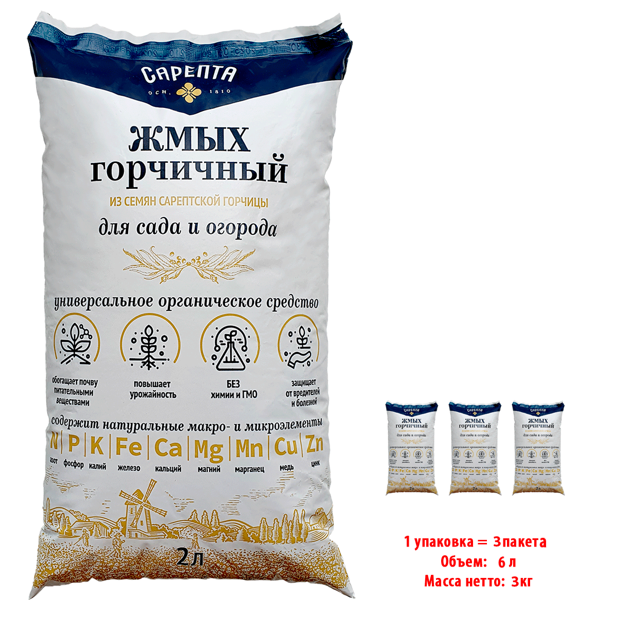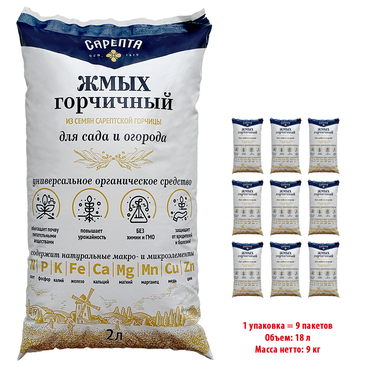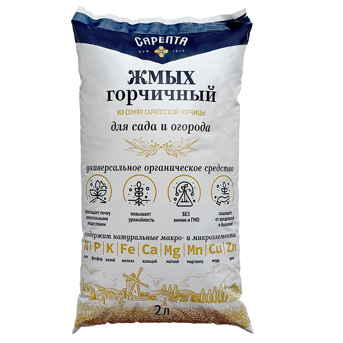 Жмых горчичный для сада и огорода «САРЕПТА» — это продукт переработки маслосемян горчицы, получаемый в процессе отжима растительного масла из семян методом холодного прессования и дополнительно обработанный. Представляет собой однородное порошкообразное вещество крупного помола с низким содержанием эфирных масел горчицы.